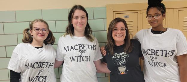 Mrs. Putyrski and her students having fun on Halloween while reading Macbeth!