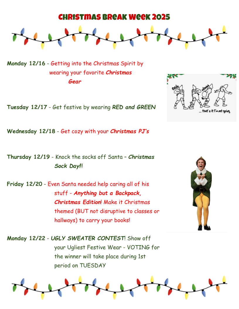 Next Week's Spirit Week for the HIGH SCHOOL Come on High Schoolers - show your Christmas Spirit!! Don't let the Elementary Students out-do you!